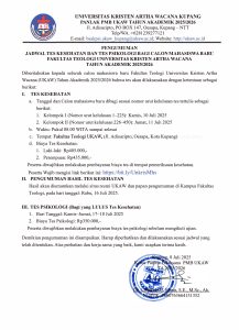 PENGUMUMAN JADWAL TES KESEHATAN & TES PSIKOLOGI BAGI CALON MAHASISWA BARU FAKULTAS TEOLOGI UKAW T.A. 2025/ 2026