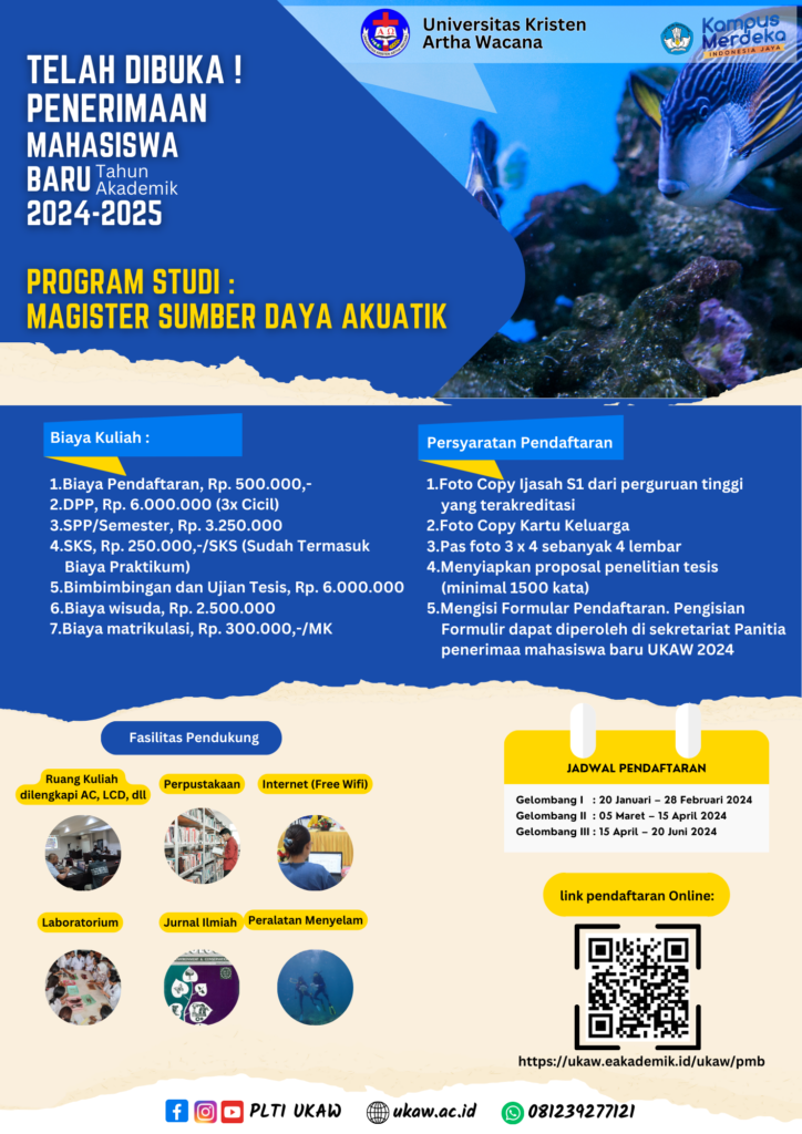 AKADEMIK FAKULTAS PERIKANAN & ILMU KELAUTAN PASCA UKAW PENGUMUMAN Telah Dibuka! Penerimaan Mahasiswa Baru TA. 2024/2025 Progdi: MAGISTER SUMBERDAYA AKUATIK January 24, 2024 Post navigation Previous UKAW MEMBUKA PENDAFTARAN MAHASISWA BARU TAHUN AKADEMIK 2024/2025Next AYO MEMILIH, JANGAN GOLPUT Leave a Reply Cancel replyYour email address will not be published. Required fields are marked *Comment * Name * Email * Website Save my name, email, and website in this browser for the next time I comment. Δ More Stories 2 min read AKADEMIK ALUMNI ARTIKEL KEMAHASISWAAN KERJASAMA REKTORAT Perkuat Kerja Sama Internasional, UKAW Kunjungi UNITAL dan IPDC di Timor Leste January 2, 2026 Lai Riwu Kaho 2 min read AKADEMIK KERJASAMA REKTORAT Tim UKAW Kunjungi Universitas Brawijaya, Bahas Pembukaan Fakultas Kedokteran dan Penandatanganan MoA Tiga Fakultas December 10, 2025 Lai Riwu Kaho AKADEMIK KEMAHASISWAAN PENGUMUMAN PENGUMUMAN March 26, 2025