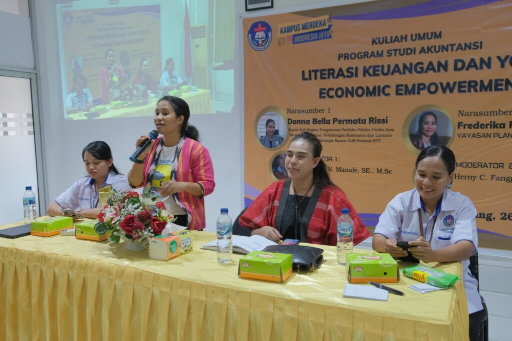 Pada Selasa, 26 November 2024, Program Studi Akuntansi Fakultas Ekonomi Universitas Kristen Artha Wacana (UKAW) Kupang menggelar kuliah umum bertajuk “Literasi Keuangan dan Youth Economic Empowerment”. Acara ini menghadirkan dua pemateri utama, yakni Donna Bella Permata Rissi, Kepala Sub Bagian Pengawasan Perilaku Pelaku Usaha Jasa Keuangan, Edukasi, Pelindungan Konsumen, dan Layanan Manajemen Strategis Kantor OJK Provinsi NTT, serta Frederika Rambu Awa dari Yayasan Plan Internasional Indonesia. Kuliah umum ini diikuti oleh 103 peserta secara langsung dan 88 peserta secara daring.
