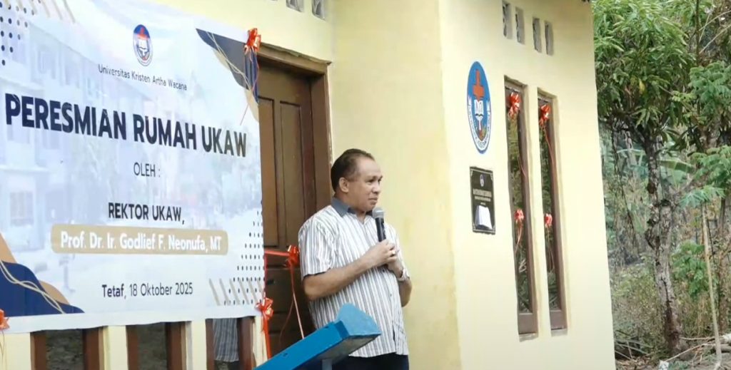 TTS, 18 Oktober 2025 — Suasana sukacita menyelimuti tenda acara di Desa Tetaf, Kabupaten Timor Tengah Selatan (TTS), saat Universitas Kristen Artha Wacana (UKAW) Kupang secara resmi menyerahkan satu unit rumah bantuan kepada Mama Lasboi, seorang warga yang selama ini berjuang untuk memiliki tempat tinggal layak huni.